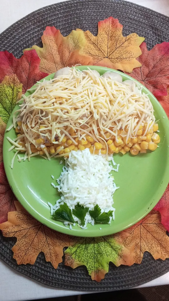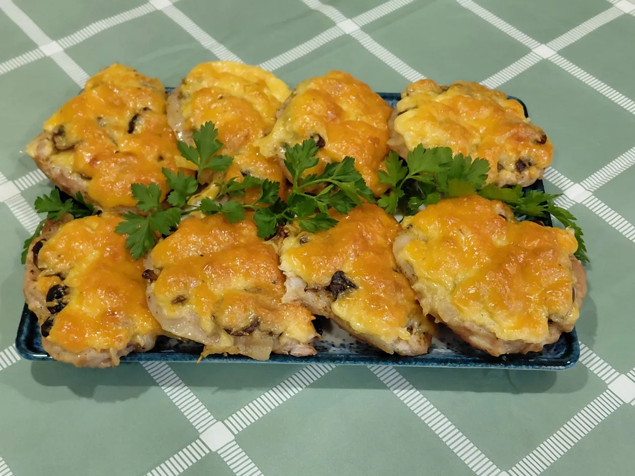 Kami melakukan semuanya sesuai prinsip salad “Mantel Bulu”. Kami mengoles kentang hingga membentuk topi, mencubit ujungnya dengan sendok, mengoleskan mayones di atasnya, memberi garam dan merica secukupnya. Saya hanya mengoles